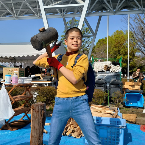 そして、お祭り参加の方には、ハンマーを使って「薪割り」をしてもらいました。